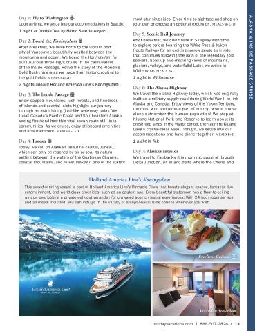 mountains and ocean. We board the Koningsdam for      that continues following the path of the legendary gold   AL A SK A & INSIDE PA S SAGE CRUISE
